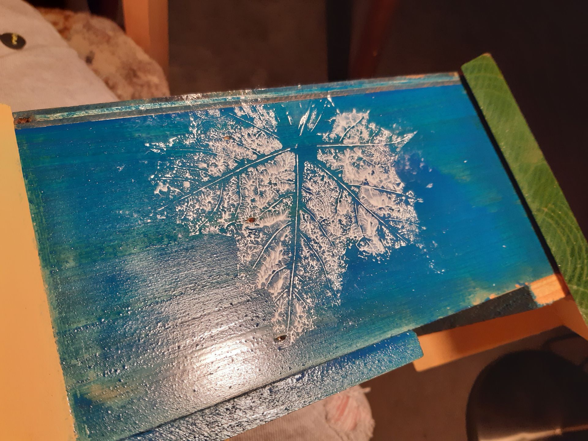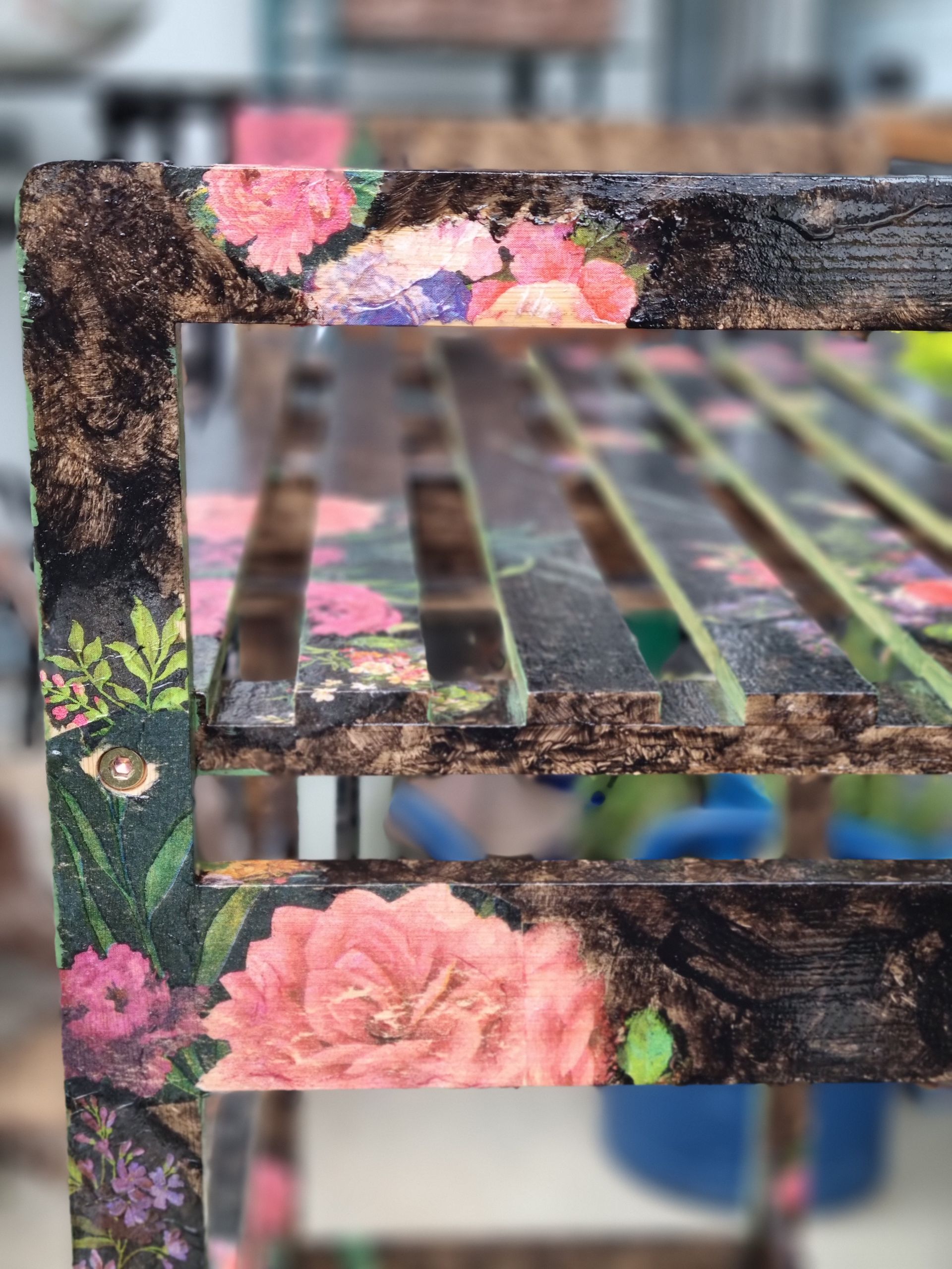 Holzregal überarbeitet mit Acrylfarbe und Serviettentechnik - Detailansicht