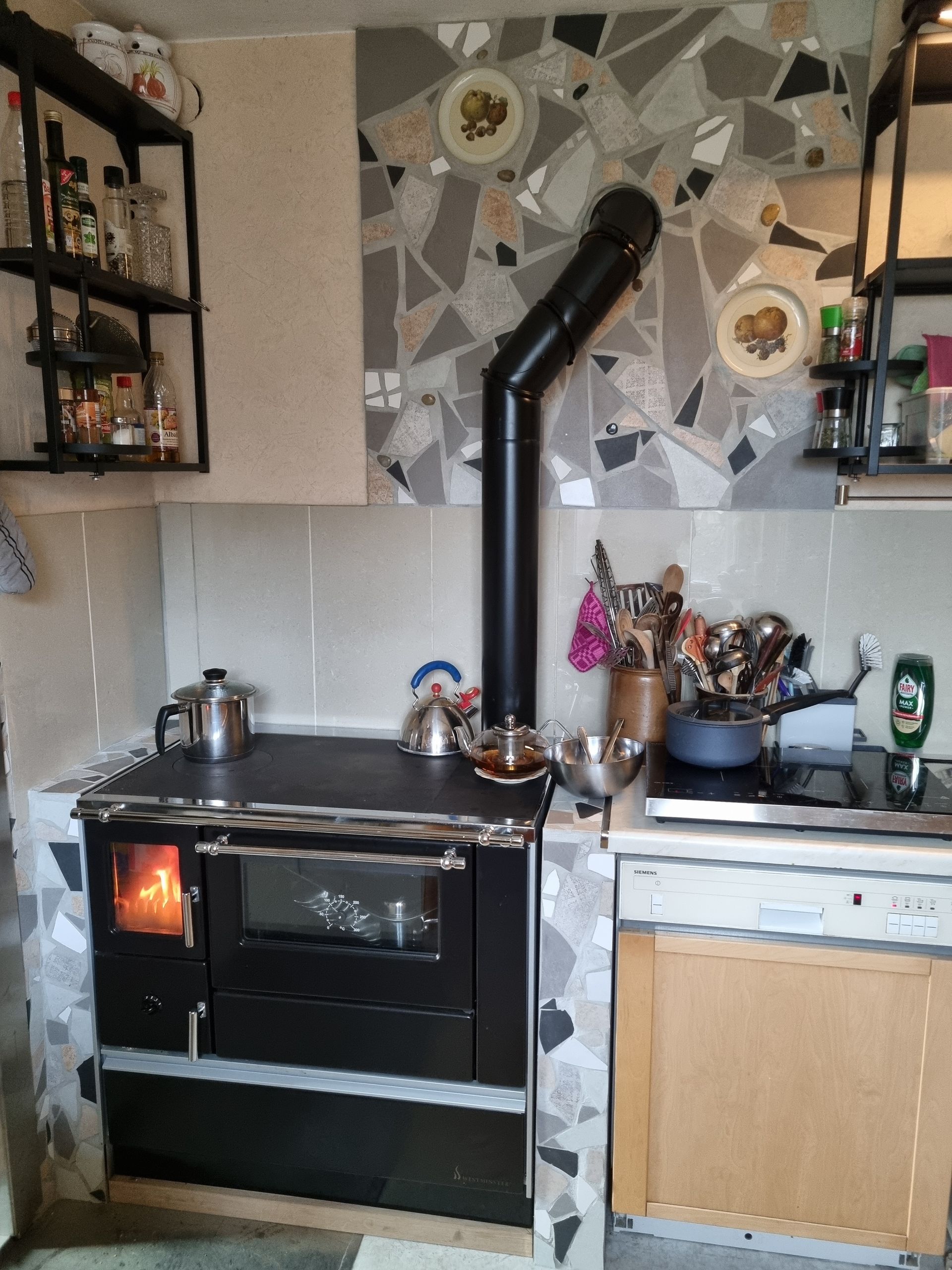 Ofenverkleidung aus Fliesenresten und 2 Schmucktellern